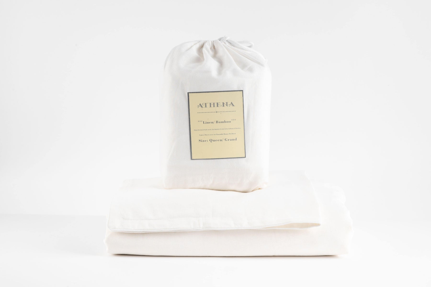 Duvet Cover Sets, Sheet Sets, and Pillow Cases made of Linen and Bamboo from Canada with packaging- The  Brand is Athena